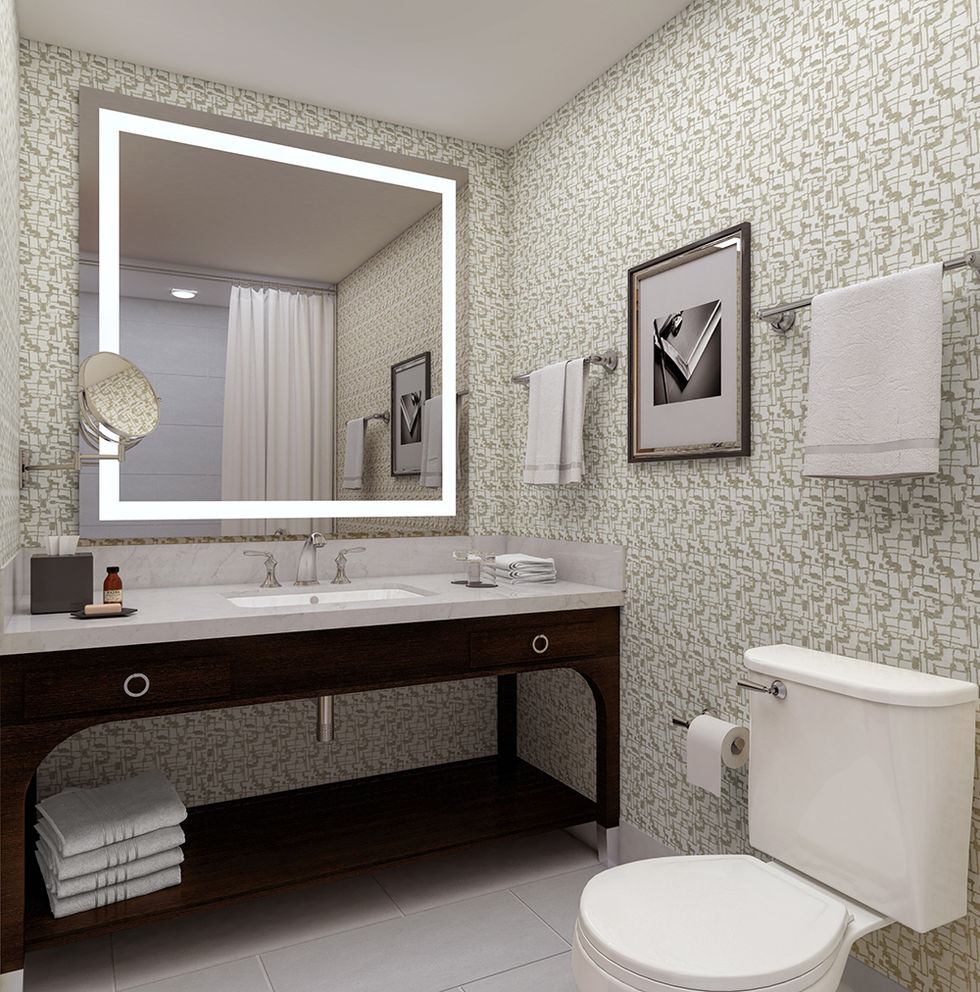 A renovation of 226 guest rooms and 50,000 square feet of public space that draws inspiration from the building’s existing postmodern structure, the site's history with the Ford Motor Company, the Sheraton brand's affinity for geometric patterns and the meaning of Mahwah in a local Native American language: place where paths meet. The open floor concept of the lounge was carved into the hotel’s previously compartmentalized plan, while maintaining the bold original ceiling and wall architecture. Guests are provided an overall casual lounge atmosphere with a network of environments promoting relaxation, interaction, amusement or productivity. Commissioned and selected artwork is a unification of geometric and automotive imagery, best seen in the installation behind the reception desk: a series of toy cars assembled in chevron patterns. Repetitive linear elements evoking intersecting trails are applied to the design of the custom carpets, wall coverings and screens, as well as the overall space planning of public areas. The overall result is visually appealing spaces that enhance each guest's experience while celebrating the history of Mahwah and the Sheraton brand.
